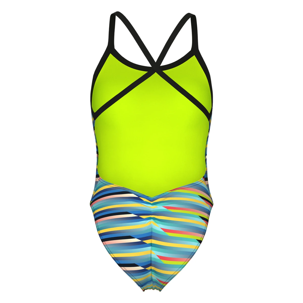 Ten damski strój kąpielowy Arena to doskonały wybór dla pływaczek trenujących regularnie i intensywnie. Model RACING STRIPE łączy dynamiczny, sportowy charakter z przyciągającym uwagę designem – wielokolorowe paski i klasyczny fason podkreślają sylwetkę oraz nadają jej energicznego wyglądu. Wysokie wycięcie na nogi i krój Xcross zapewniają pełną swobodę ruchu, idealną do pływania w każdej technice.